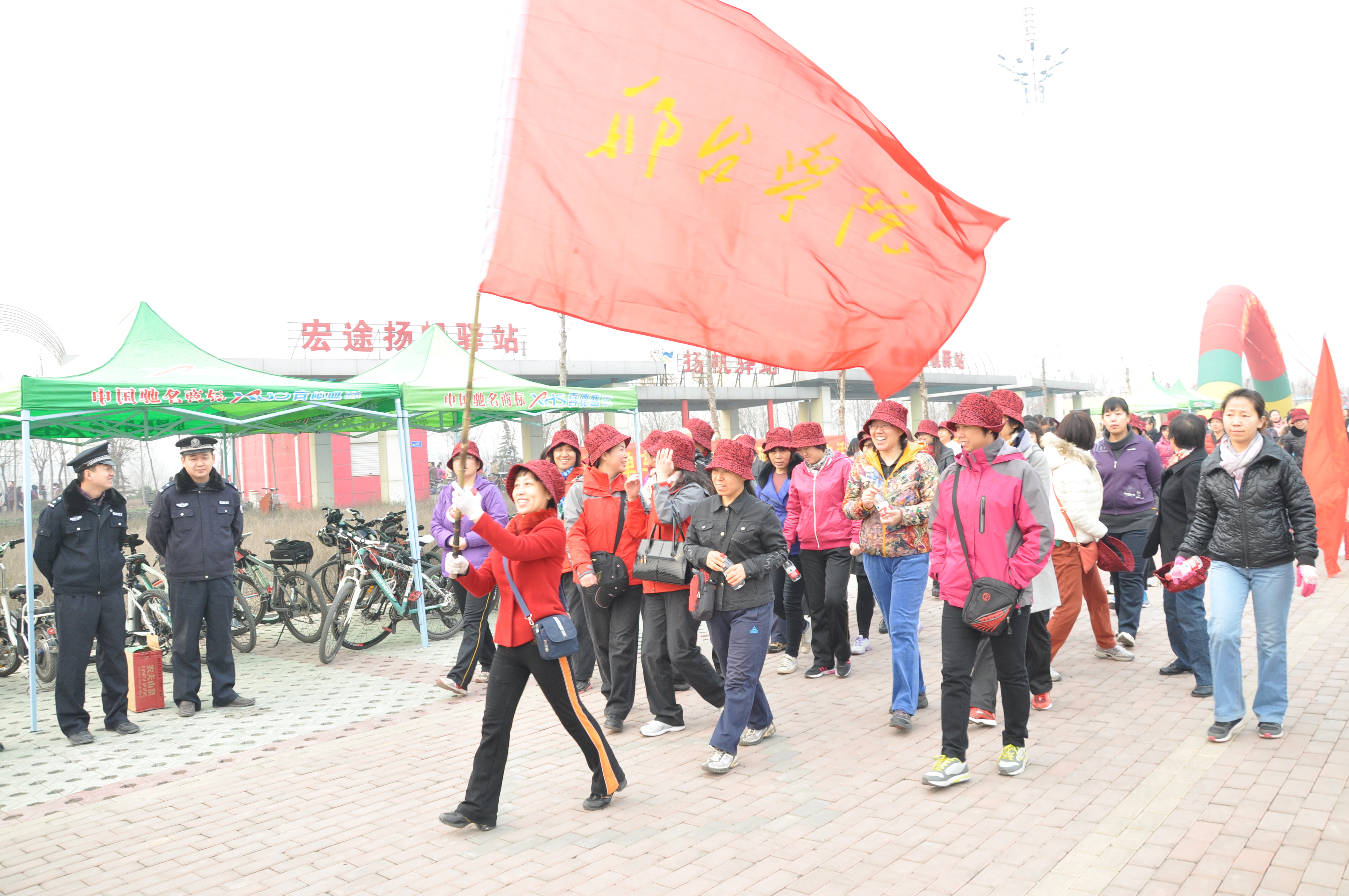 3月8日上午,我院一百多名女教工参加了邢台市妇联组织的邢台市第二届女职工庆“三八”健步走大型群众体育活动。春风轻拂,暖阳高照,我们邢台学院的旗帜在七里河畔高高飘扬。女教工们举起“健步走,走出健康和美丽------邢台学院代表队”的标语,在邢台学院的旗帜的引领下欢快自信地参加了八公里的徒步,展示了我院女教工良好的精神风貌。被市妇联、体育局授予优秀组织奖。