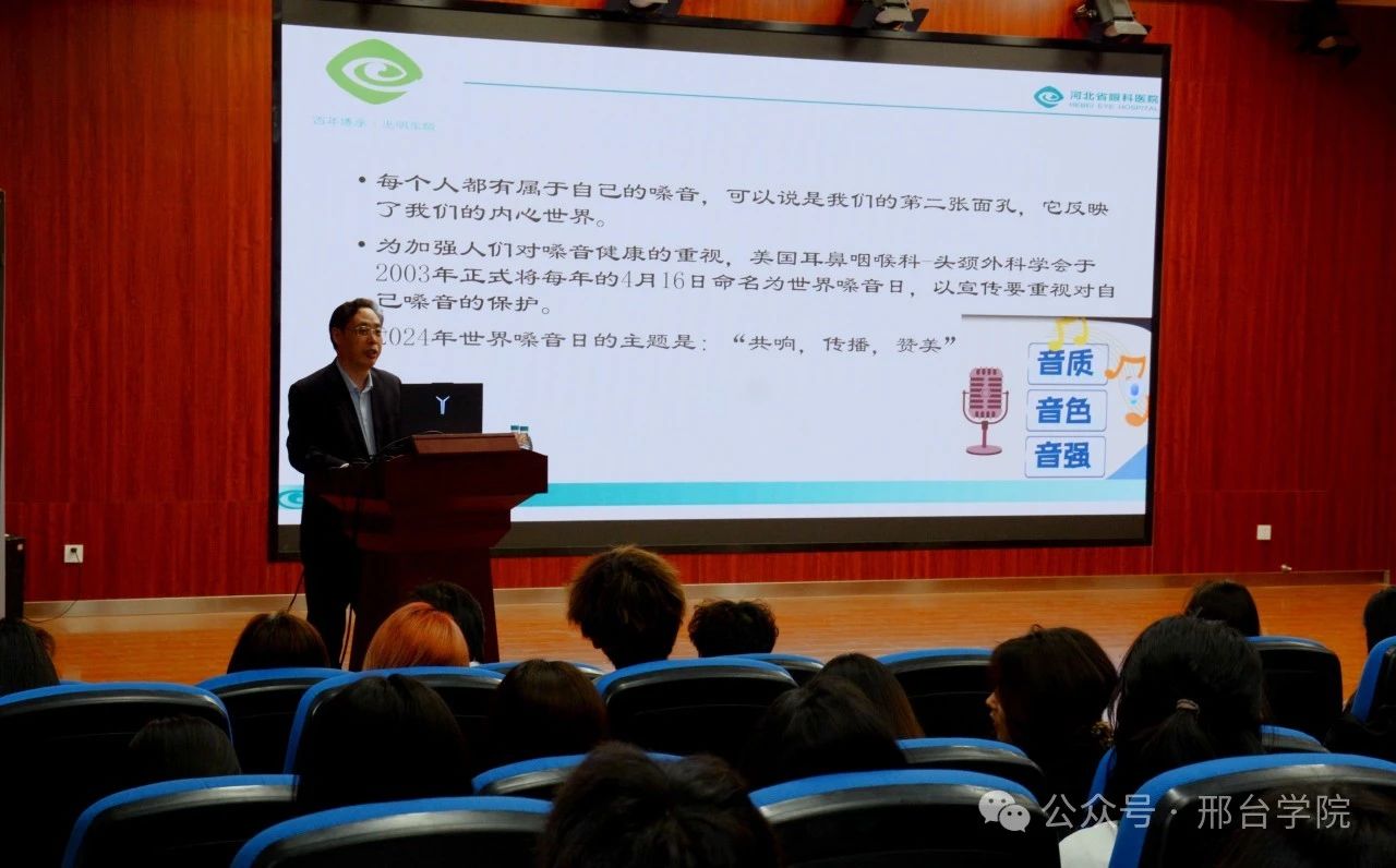 4月16日是第22个世界嗓音日。校工会、校医院联合邀请河北省眼科医院耳鼻咽喉头颈外科主任刘朝兵、副主任张晓岚在4号楼101教室举办“保护嗓子 关注嗓音健康”世界嗓音日专题知识讲座。讲座由校医院胡立娟主持,一百多名师生聆听了讲座。